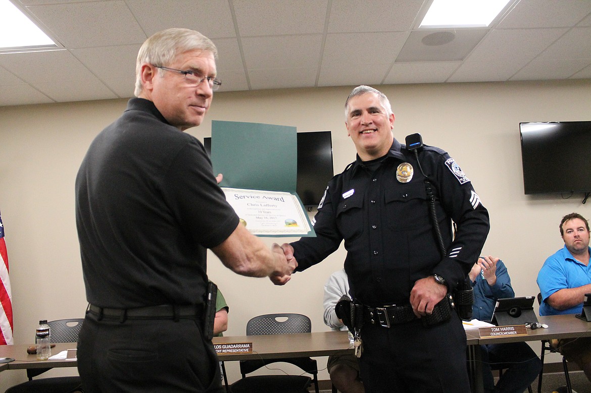Interim Police Chief William Larson thanked Sgt. Chris Lafferty for 10 years of service on Tuesday, presenting the long-serving officer with a certificate and a pin denoting the time he has served in Quincy.