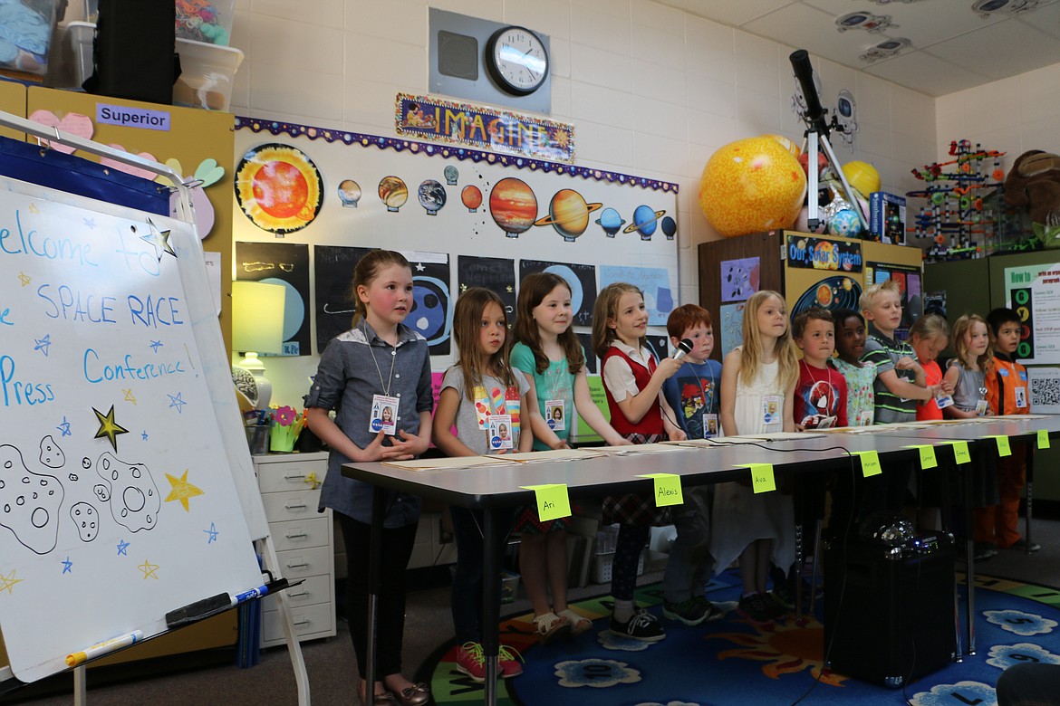 These were some of the answers to questions aimed at Farmin-Stidwell Elementary students during a mock press conference Thursday, which was the culmination of their year-long "Space Race" program. First- and second-graders, as well as one third-grader, participated in the "Space Race" in the experiential learning program at Farmin-Stidwell, with teachers Laurie Stevens and Nicole Huguenin.