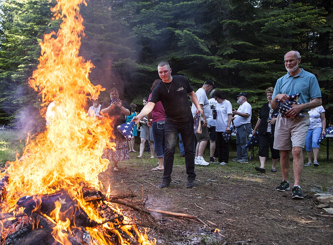 On Sunday, more than 20 individuals, many of them military veterans, gathered in Hayden to burn — the traditional way flags are properly retired — 148 American flags and 16 POW flags. David Hampton, who works for the U.S. Postal Service and is an Army National Guard veteran, began gathering the flags in November after encountering several old flags previously flown at a post office he was working at in Loon Lake, Wash., some 30 miles north of Spokane.