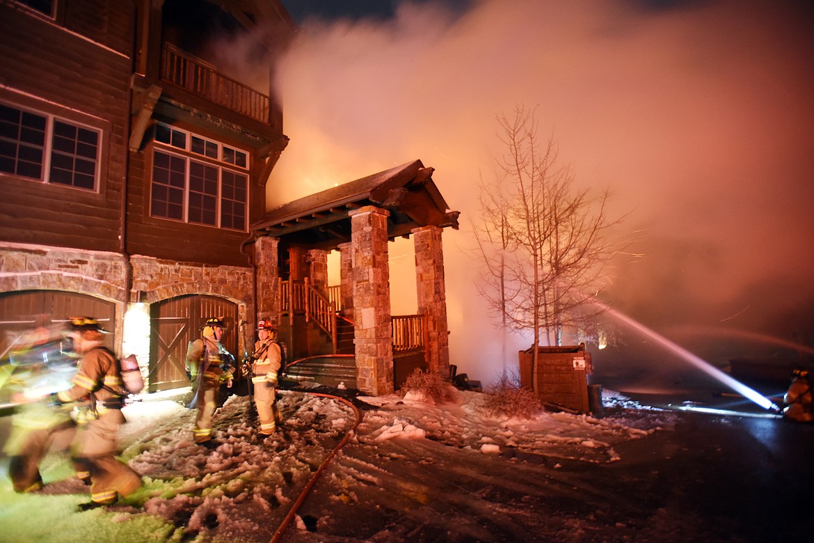 Firefighters from Whitefish Fire, Kalispell Fire, Evergreen Fire and Rescue and Columbia Falls Fire joined the team from Big Mountain Fire and Rescue to fight the massive fire on Slopeside Drive on Thursday night, November 2.(Brenda Ahearn/Daily Inter Lake)