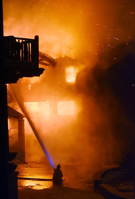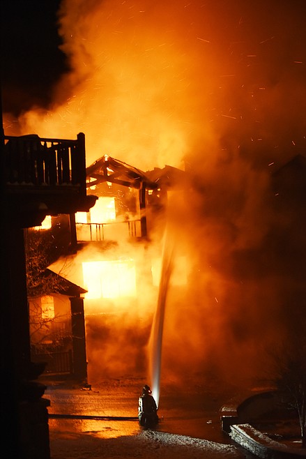 A firefighter battles a fully engulfed townhouse on Slopeside Drive on Big Mountain Thursday night. (Brenda Ahearn photos/Daily Inter Lake)