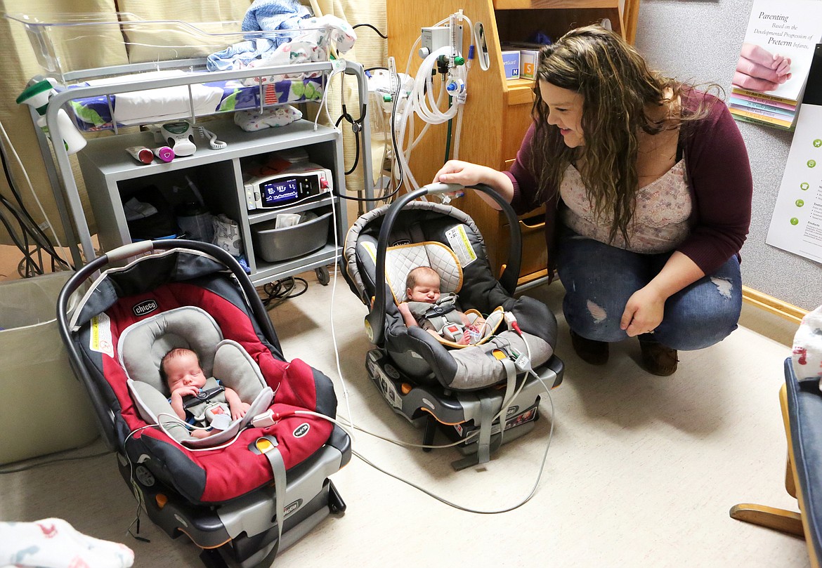 Fraternal twin brothers, Judah and Jedidiah Hall, undergo a carseat test at the Kalispell Regional Medical Center NICU to make sure the babies can regulate their body temperatures on the ride home from the hospital. Nursing student Jonathan Madany and NICU nurse Sarah Zaharia check on the boys, alonside their mother, Cassandra Hall. (Mackenzie Reiss/Daily Inter Lake)