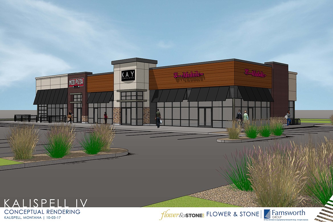 Renderings submitted to the Kalispell Planning Department by developer Flower & Stone, Ltd. depict a new building with T-Mobile, Kay Jewelers and MOD Pizza store fronts.