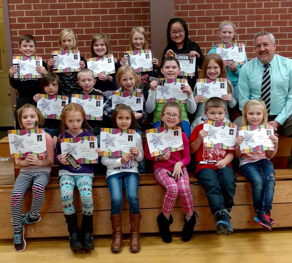 Middle row: Gaege McLean, Braden Chrisman, Gracie Farmin, Melanie Soto, Kendyl Bircher, and principal Mike Groves.