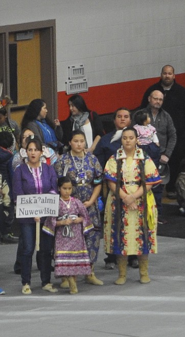 Sitting together about halfway up the bleachers and off to the side were three girls dressed in Salish regalia, taking in the scene they know so well.
