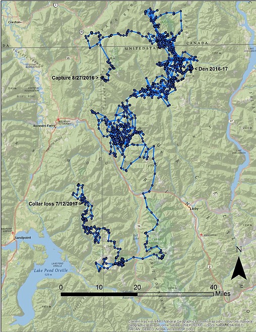 The 2016 augmentation male from the Cabinet Mountains could not be located during November or December of 2016 but was located in early May of 2017 and he lost his collar during June of 2017. The download of his radio collar revealed extensive movements to the south end of the recovery area during November and December of 2016 prior to denning on Graves Peak in Deep Creek about 12 miles north of Thompson Falls, Mont. He emerged from his den in early April and has since returned to the main Cabinet Mountains Wilderness where he lost his collar in June of 2017. Figure 1 traces his route from November when we lost his signal south to his den and then from den emergence north to his location in May.