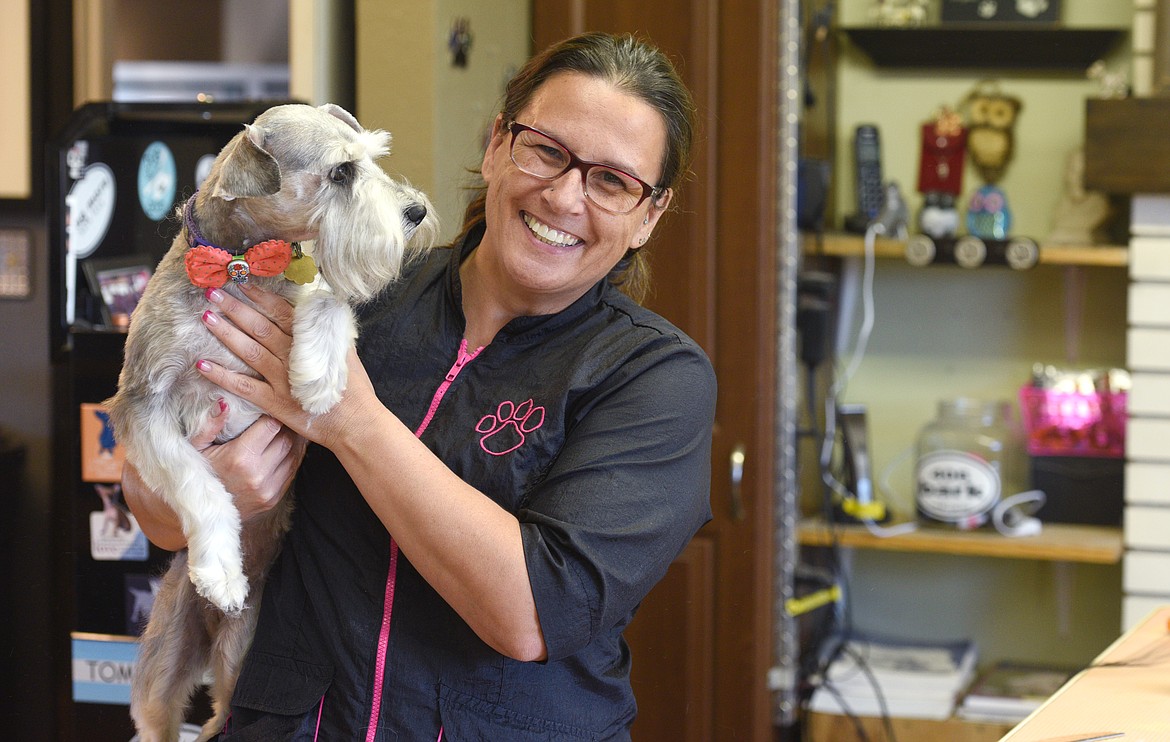 After a long day grooming and caring for dogs on Sept. 19, Lynnie Evans flipped the “open” sign to “closed” at her Evergreen business, Pawsitively Perfect. Sitting cross-legged on a grooming table she brushed a wisp of stray dog hair off her smocked shoulder.