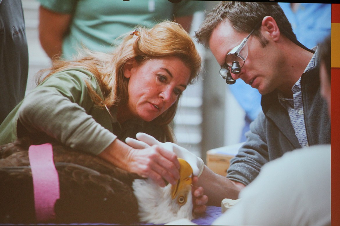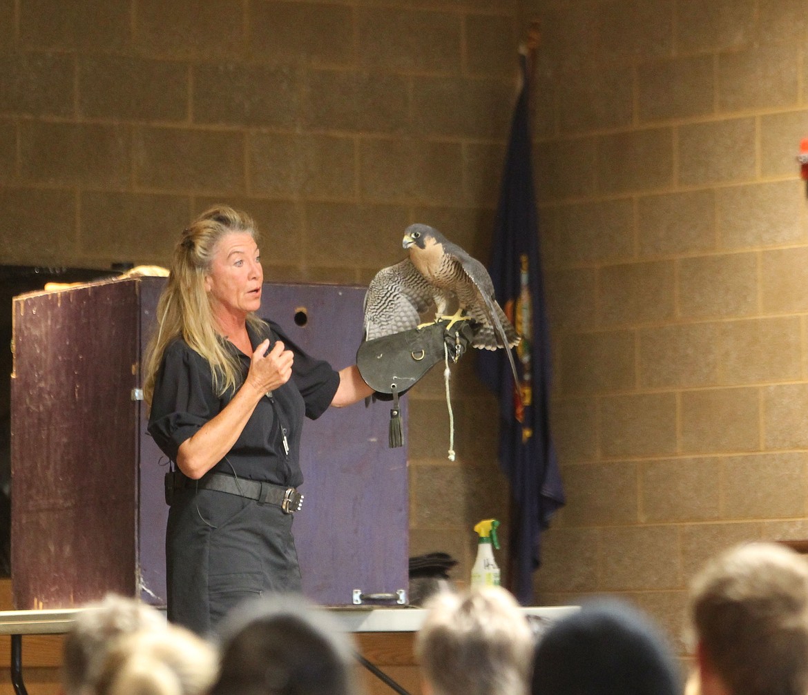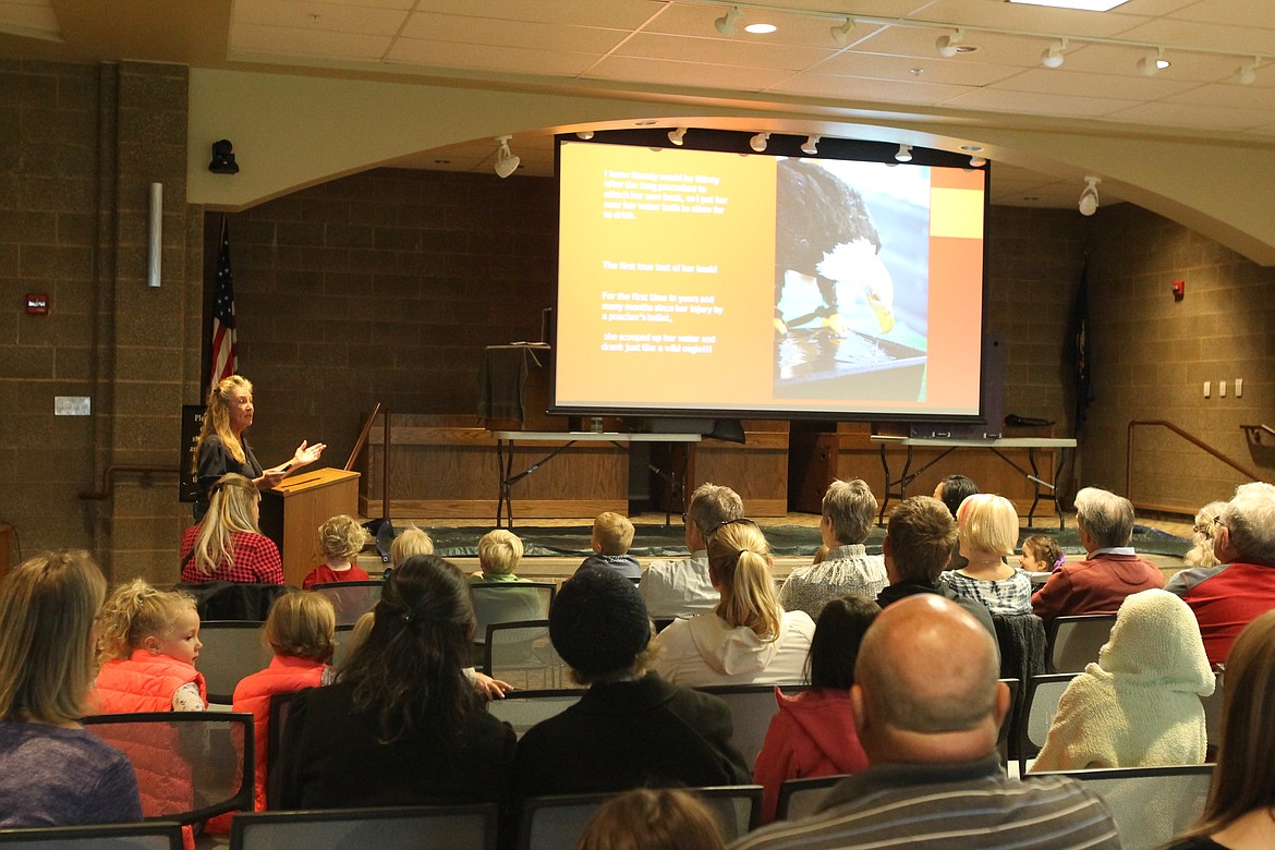 Beauty is now 16 and a “display” bird that doesn’t travel from her home at Birds of Prey Northwest near St. Maries. Although she did not make an appearance at the library, Veltkamp and her husband, Don, brought four other magnificent feathered friends with them to the event — a red-tailed hawk, a great horned owl, a peregrine falcon and a golden eagle — to educate and inspire the attendees