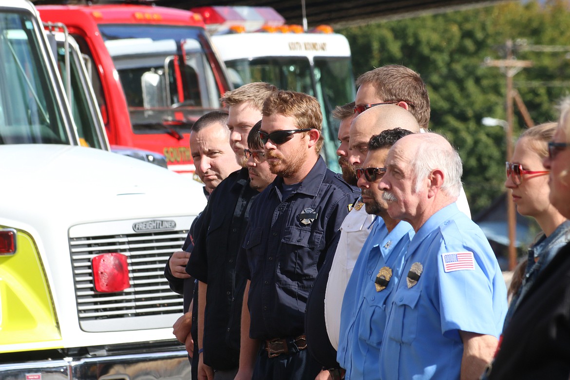 Fire agency personnel then read the names and departments of each of the fallen heroes, taking turns despite the train the roared through. Chaplain Earl Matthews read the Fireman’s Prayer, followed by a moment of intense silence, before Chaplain Lewis Clark stepped up to join together the audience in a prayer.