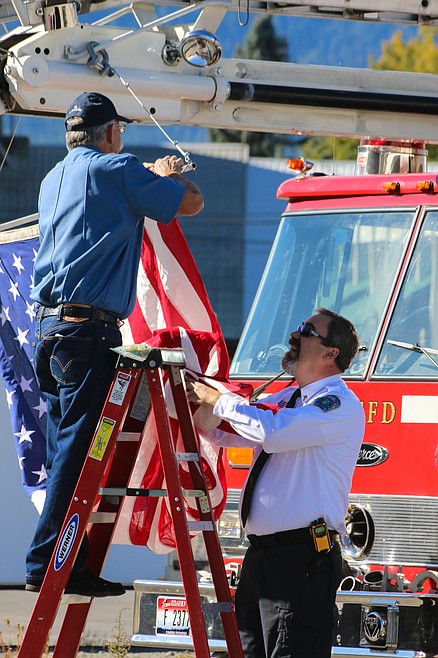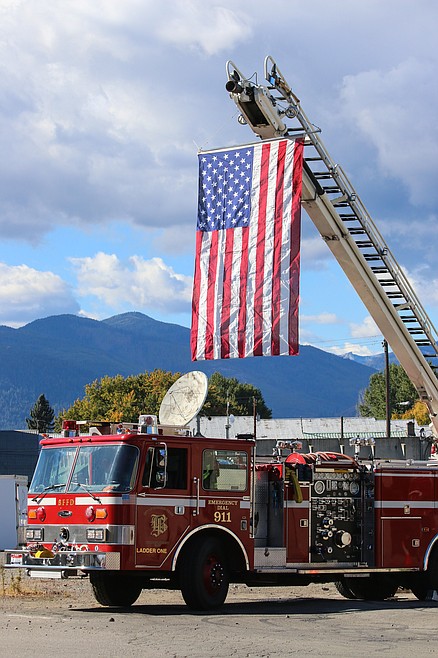 The exception was Bonners Ferry Department Ladder 1, which was adorned with the American flag, attached to the tip of its ladder, then raised high over Arizona Street, next to the fire department.
