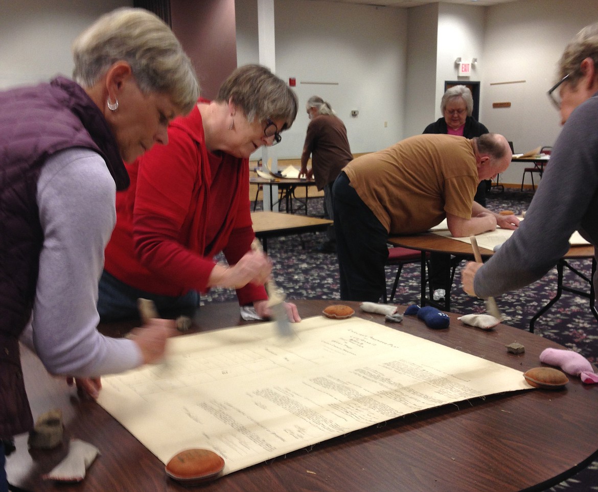 Volunteers take part in an Archives Blitz in the Ponderosa Room next to Libby City Hall Thursday, Oct. 12. The week-long event was made possible by a a state grant to process and preserve historic archival materials. In this photo, the map in the foreground is being cleaned and repaired, while in the background maps are being protected and stored. Lincoln County Clerk and Recorder Robin Benson applied for the grant and organized the event to inventory, document and preserve these historical county maps. (Photo by Robin Benson)