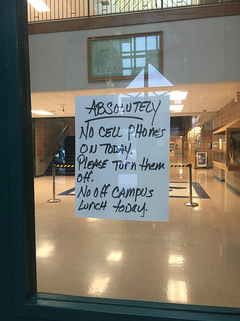 Handwritten signs were taped to the doors of the school alerting students they were not to turn on or use their cellphones, and no student would be allowed to leave campus for lunch.