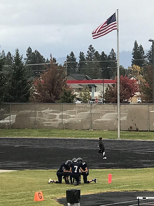 Four players — Noah Martinez, No. 7; Matthew Whitcomb, No. 10; Aiden Fink, No. 2; and Jace Bowman, No. 88 — take a knee and pray every game, but the sight of them praying before Thursday's home game against Coeur d'Alene High School really struck a chord with those in attendance.