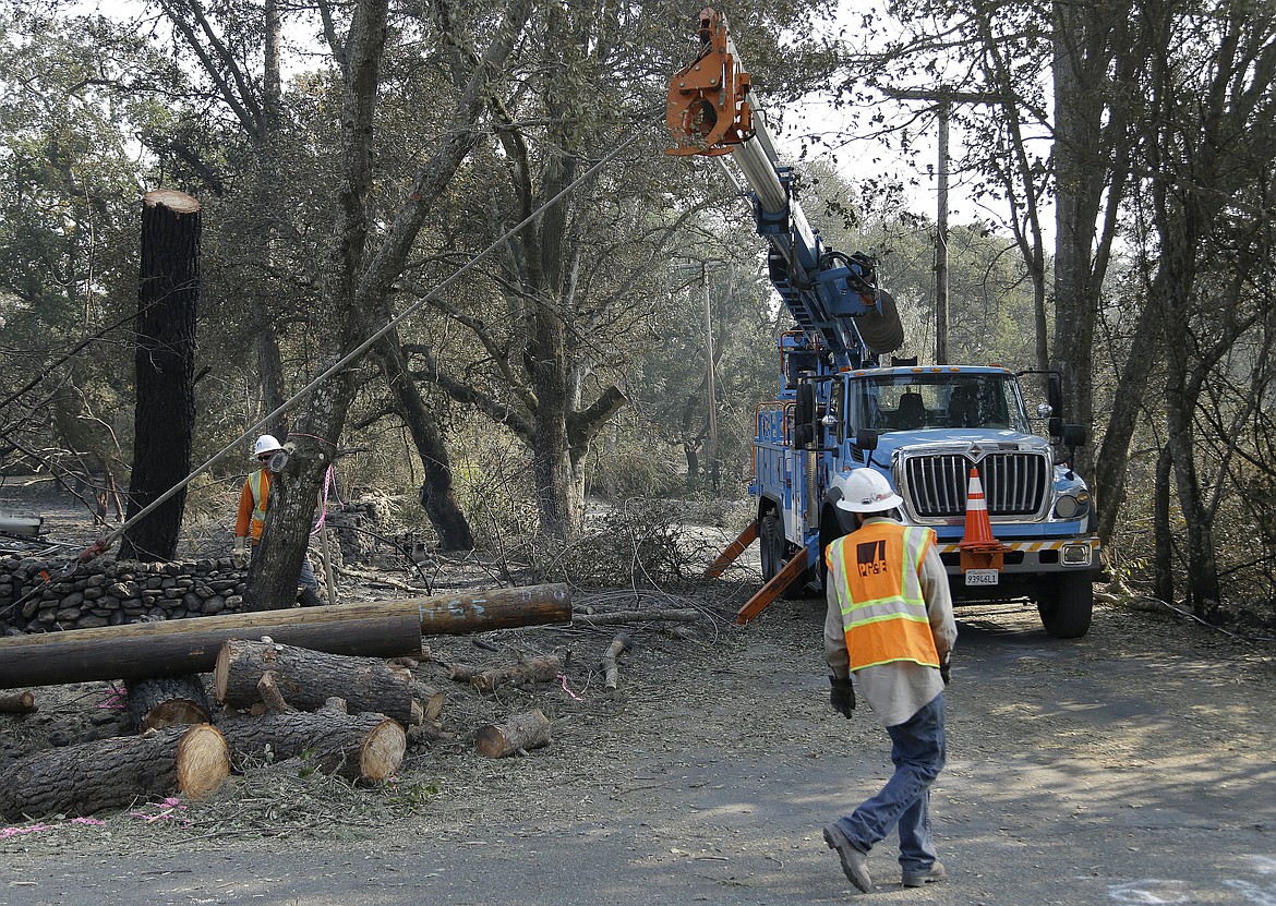 A Pacific Gas & Electric crew work on replacing poles Wednesday, Oct. 18, 2017, in Glen Ellen, Calif. California fire officials have reported significant progress on containing wildfires that have ravaged parts of Northern California. (AP Photo/Ben Margot)