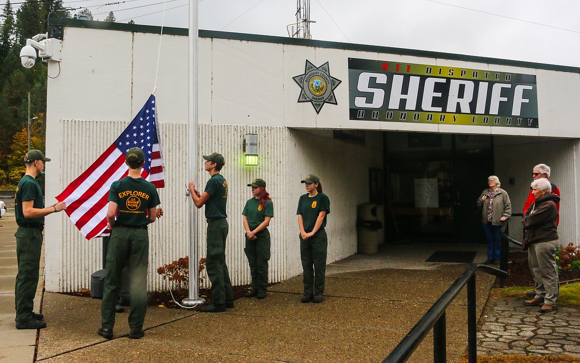 BONNERS FERRY — Despite a chilly, drizzly fall day, a large crowd gathered for the dedication and raising of the new American Flag in front of the Boundary County Sheriff’s Office at 11 a.m. on Oct. 13.