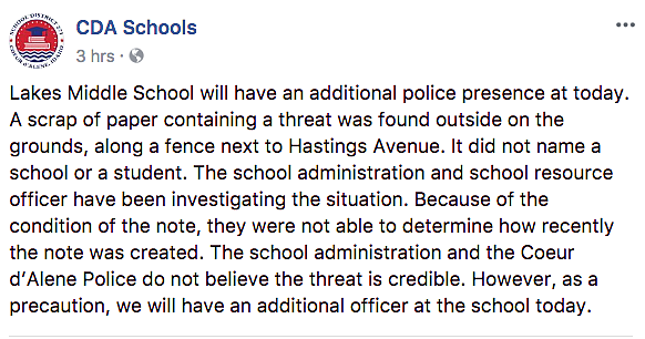 The school district’s administration and the Coeur d’Alene police are investigating the note.