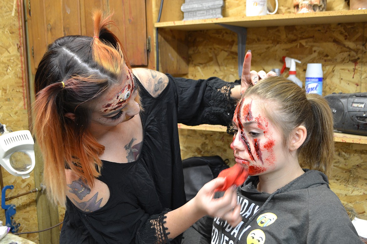 Some of these scare school students are quiet as their makeup is applied and hang out with other cast members before they take their places. Once inside, behind their makeup or a mask, things change.