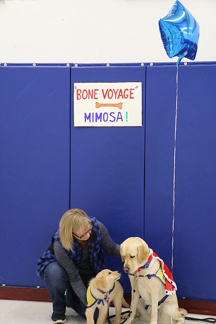 Mimosa, an 18-month-old labrador retriever, was the oldest in the class, going through each motion with perfect demeanor. She attended the Lake Pend Oreille class since it began nearly five weeks ago, and is now preparing for the next leg of her journey to become a trained companion for someone with disabilities. After spending the past several months with volunteer puppy raisers Jim and Bonnie Wakefield of Spokane, Mimosa's next stop is advanced training in Santa Rosa.