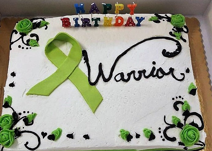 She finished treatments two weeks ago and that, along with her 56th birthday, was celebrated last weekend. Organized by her daughter Cecily, Terri was surrounded by around 25 close family and friends at the town’s community center. She was given a white sheet cake decorated with a green ribbon which simply read, “Warrior”.