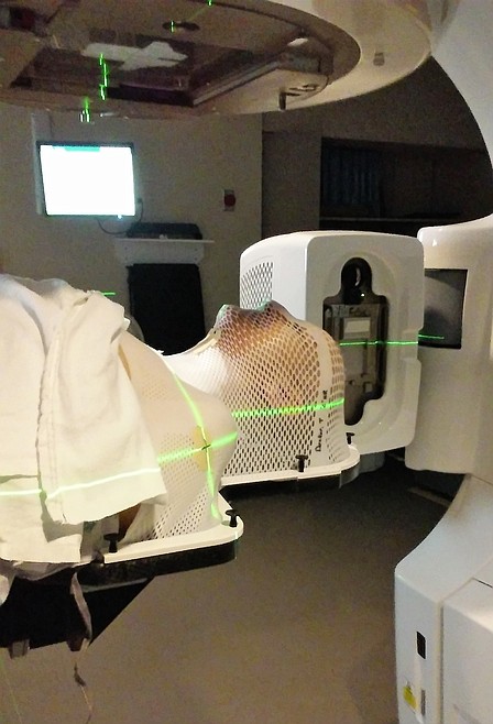 The transplant required another 21 days in the hospital, followed by rounds of radiation. The radiation was done in Missoula. Terri described that the mask they use for the treatments was a piece of soft plastic that they softened in warm water and then molded to her face. While getting the treatments, they strap her down to a table while a huge machine scans over her head and chest. The mask is used to protect her face. The process only lasts about three minutes but it left dark patches on her neck and chest much like a suntan.