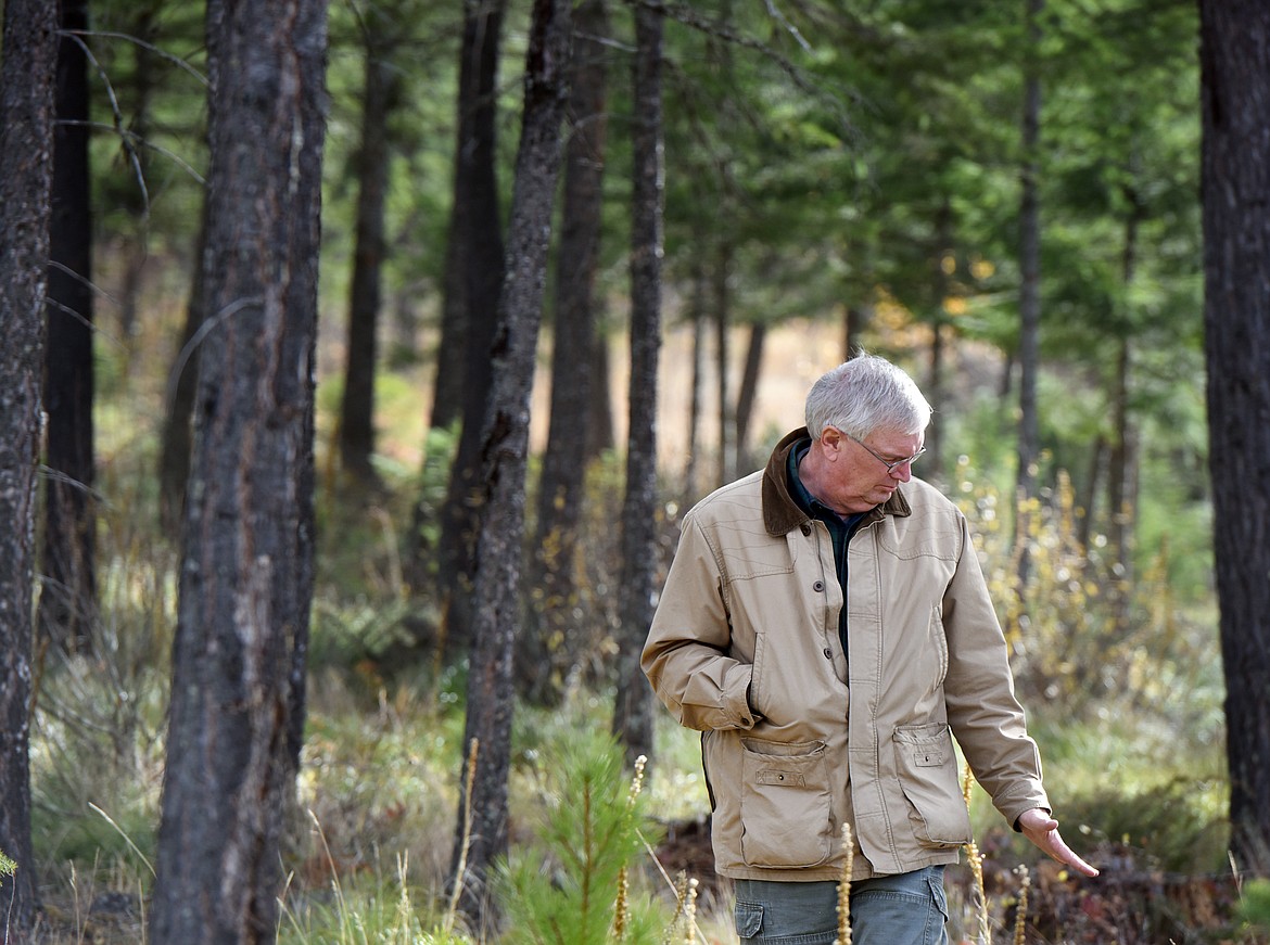 Department of Natural Resources and Conservation Forester Rick Moore walks through an area near the main gate at Glacier Hills admiring the work of Tai Foley of Safe Lands Forestry on Tuesday, October 24, in Martin City. “Tai’s created the feeling of a forested park here,” said Moore. Moore described the importance of having this area clear of the elements that fuel fires, but still has a feeling of naturalness to it. “It isn’t 100 percent fire proof, but nothing is.”(Brenda Ahearn/Daily Inter Lake)