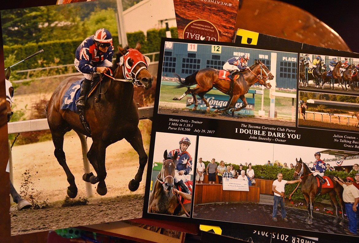 Stacks of photographs from past races show the prowess of his prize-winning thoroughbreds.