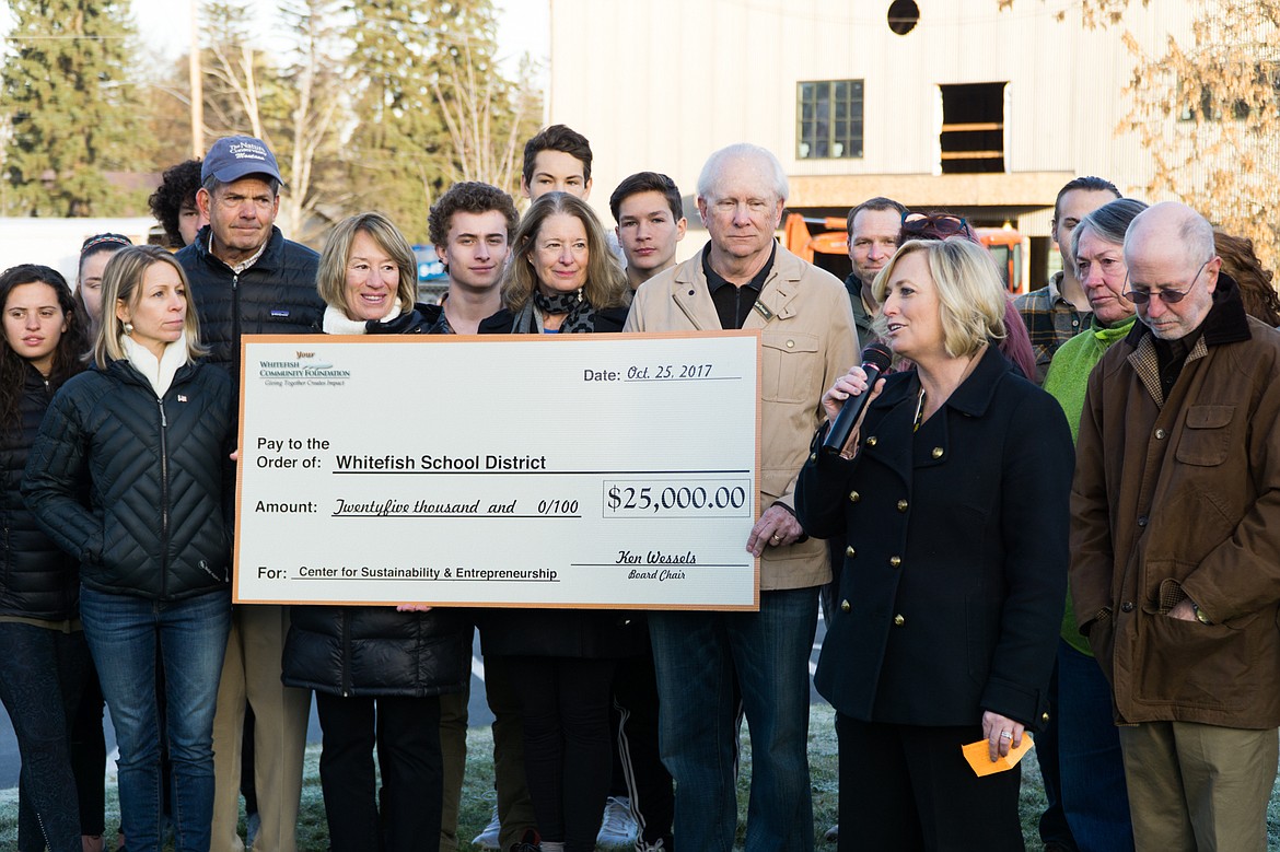 Students, teachers and members of the foundation gathered Friday for a grant ceremony in front of Whitefish High School near the construction site for the sustainability center.