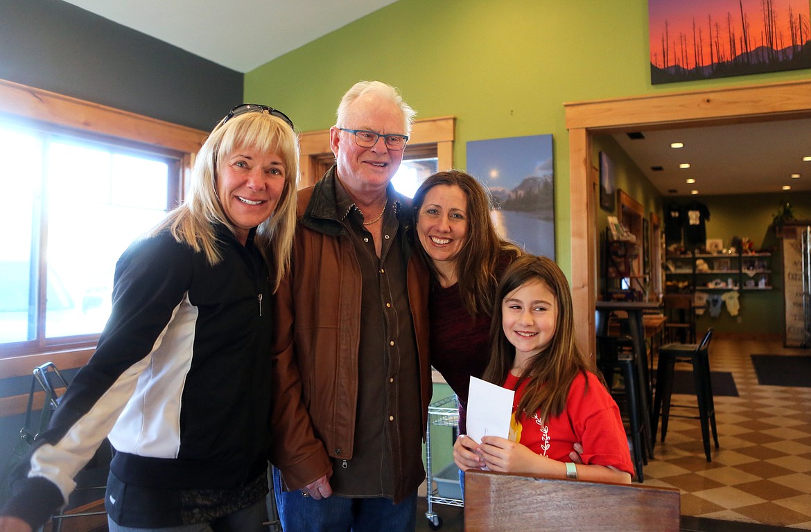 Lisa and Al Stinson pose alongside Tina and Courtney Rhoades after presenting Courtney with a check to fund her diabetic-alert dog Saturday at Glacier Perks Coffee House in Lakeside. (Mackenzie Reiss/Daily Inter Lake)