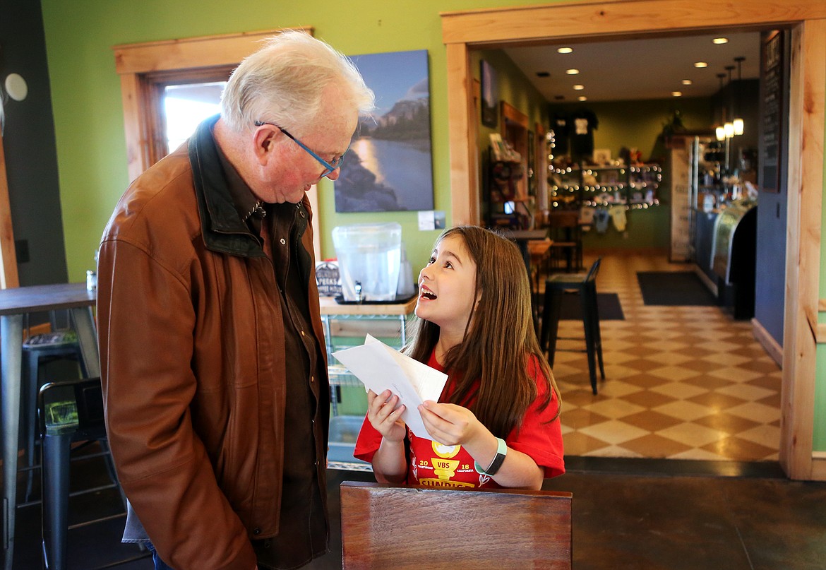 Al Stinson of Whitefish presents Courtney Rhoades with a check to help fund the purchase of a diabetic-alert dog Saturday at Glacier Perks Coffee House in Lakeside. (Mackenzie Reiss/Daily Inter Lake)
