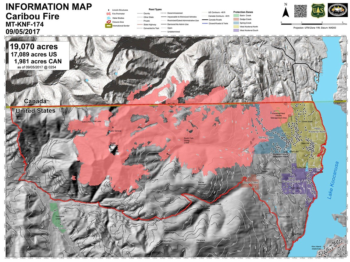 The Caribou fire is located 21 miles northwest of Eureka and was caused by lightning on Aug. 11, according to an Inciweb incident information web page. About 10 percent of the fire is in Canada.
