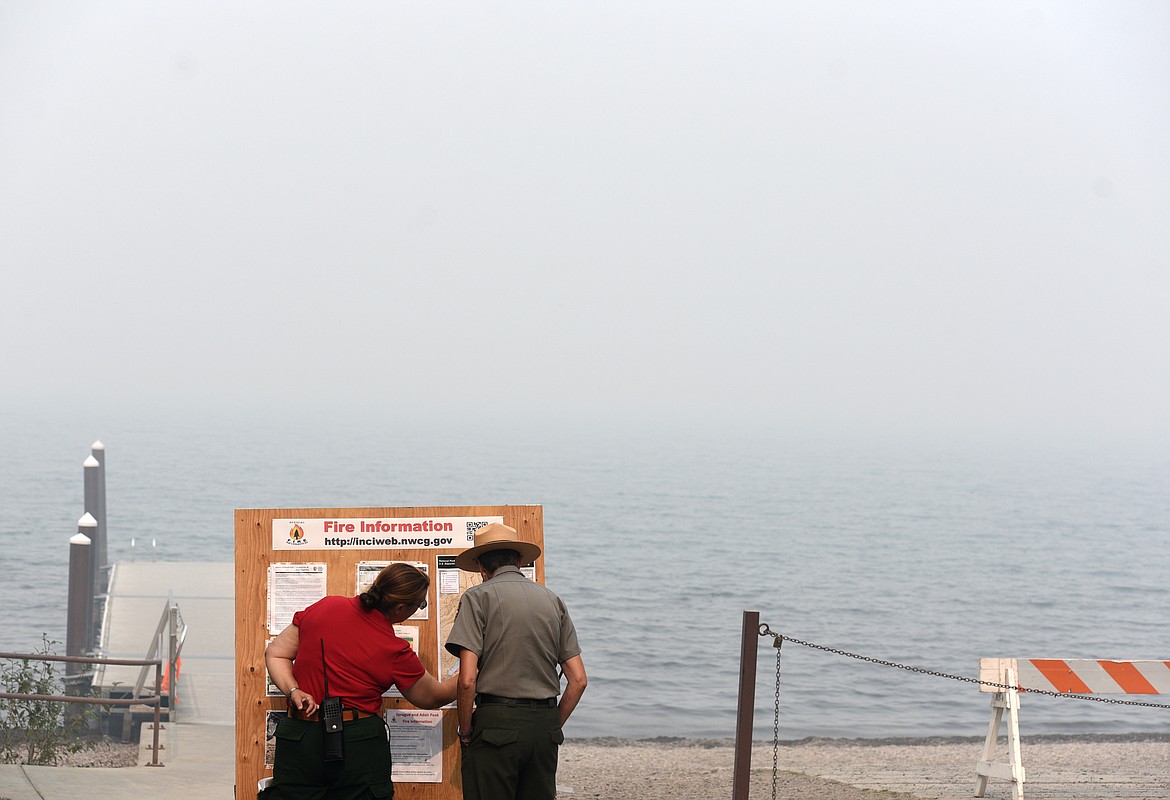 Diane Mann-Klager, the public information officer for the Sprague Fire, fills in National Park Service Ranger Mary McMahon on what is happening on the fire at the boat dock at Apgar Village on Tuesday. (Aaric Bryan/Daily Inter Lake)