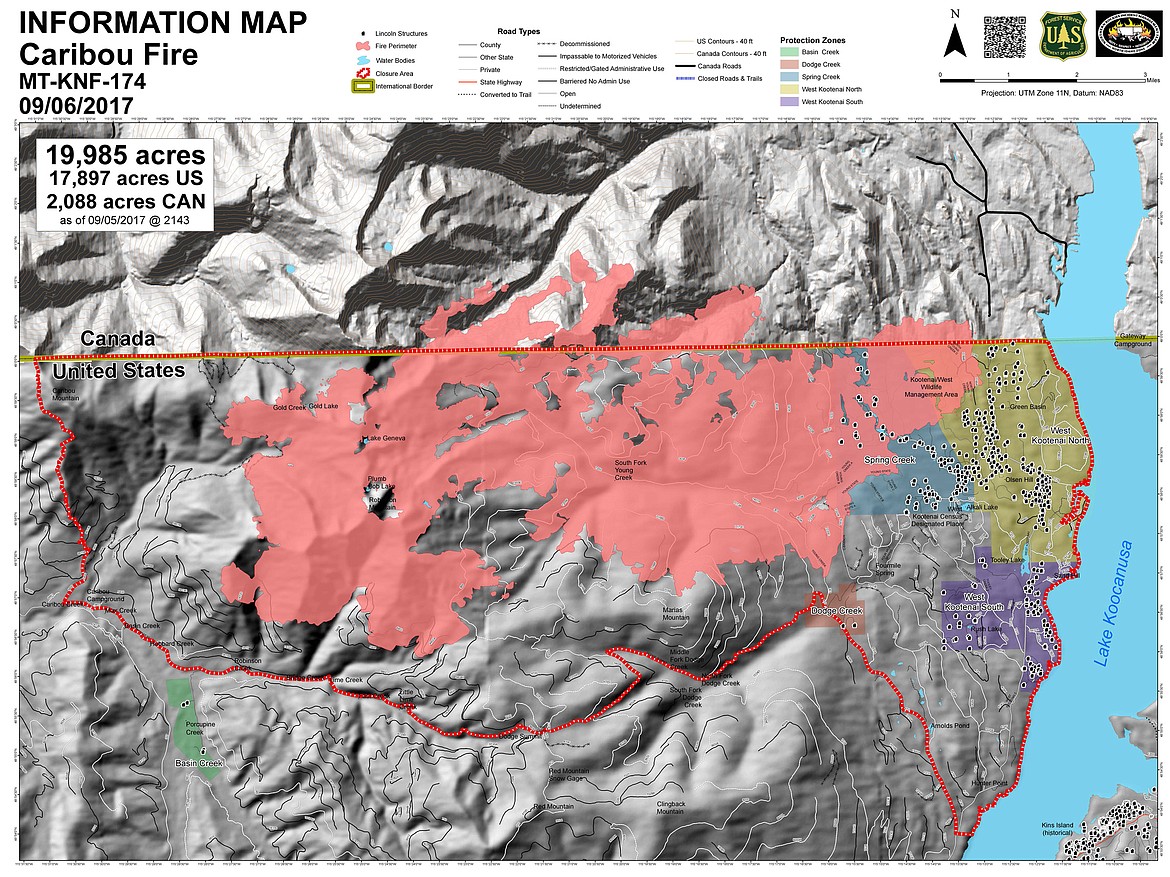 The Caribou fire is located 21 miles northwest of Eureka and was caused by lightning on Aug. 11, according to an Inciweb incident information web page. About 10 percent of the fire is in Canada.