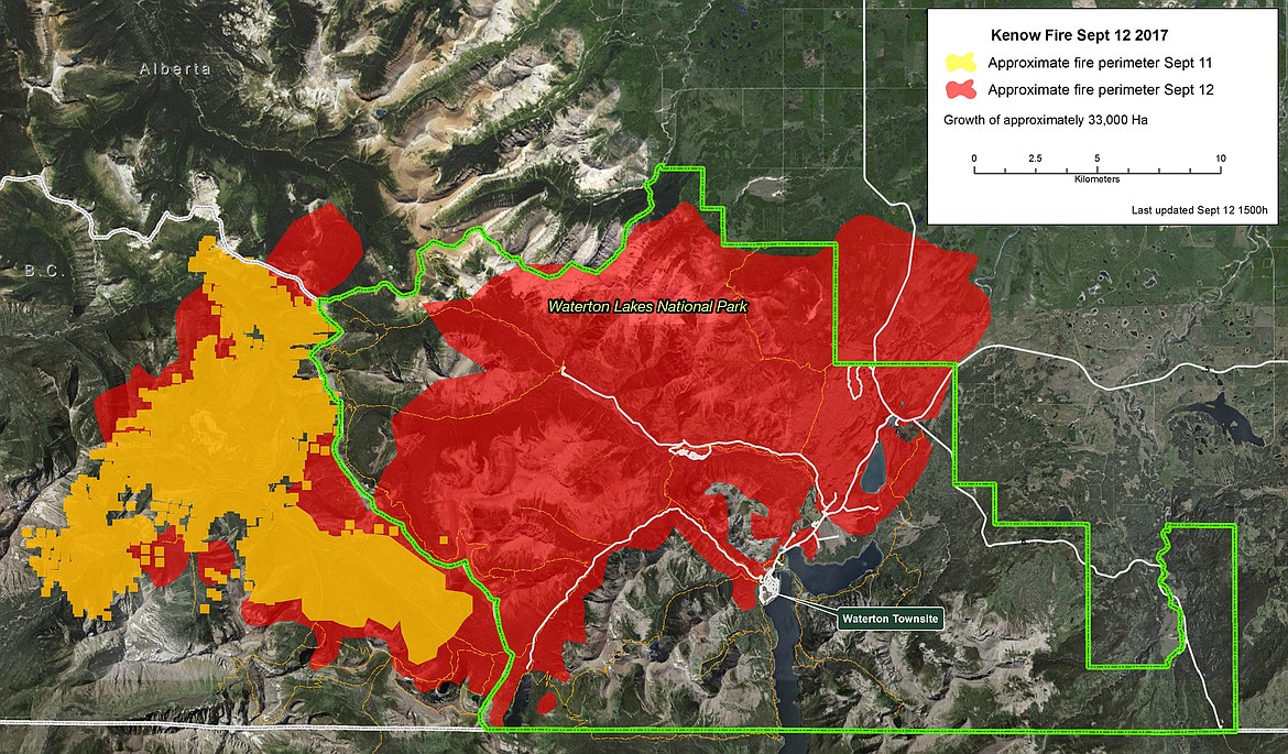 The Kenow Fire has nearly tripled in size this week as high winds stoked the blaze that is ripping through Waterton Lakes National Park in Alberta.