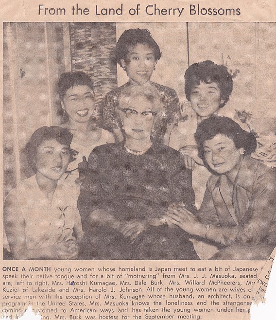 A clipping from the Daily Inter Lake shows a photograph of several Japanese war brides gathered around Aya Masuoka, who mentored the young women as they established their lives in the Flathead Valley.