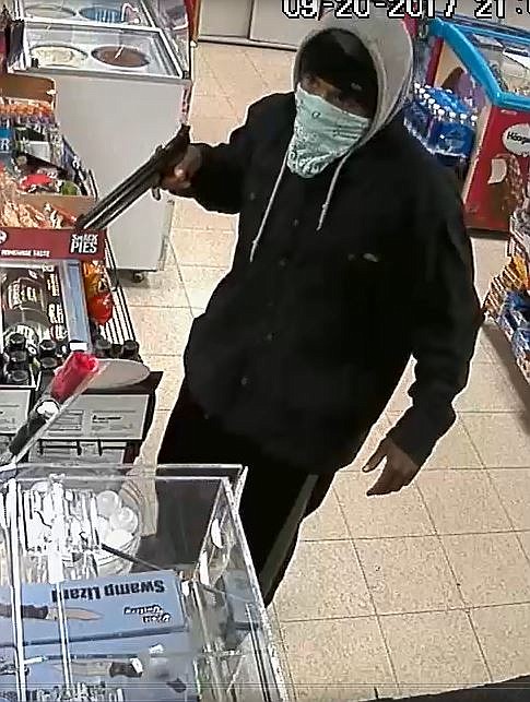 In the surveillance camera photo, the suspect appears to point a long-barrel BB or pellet pistol at the cashier.