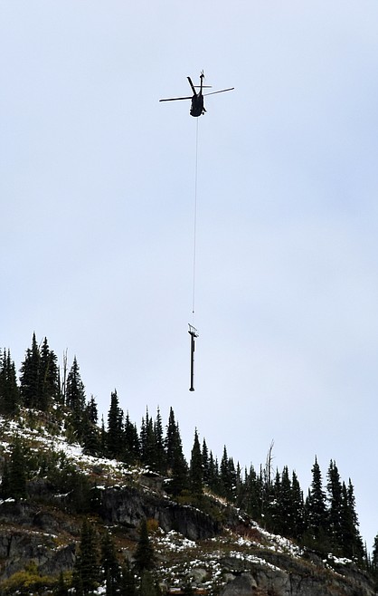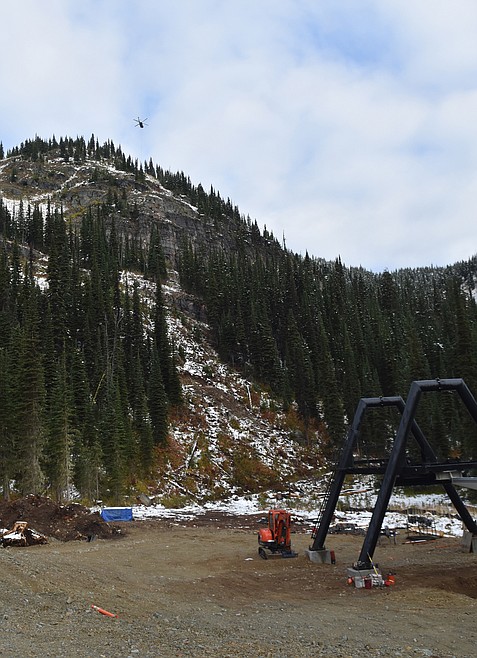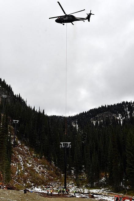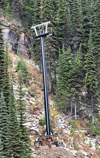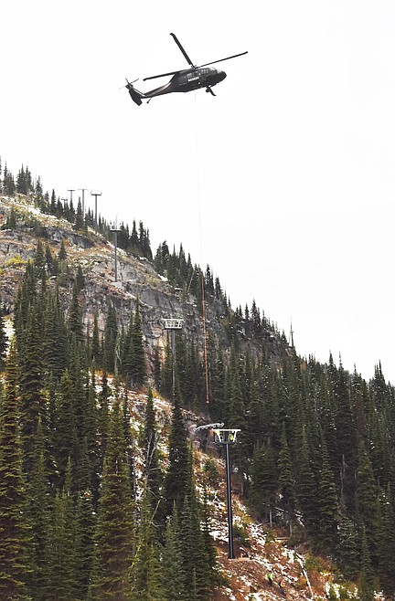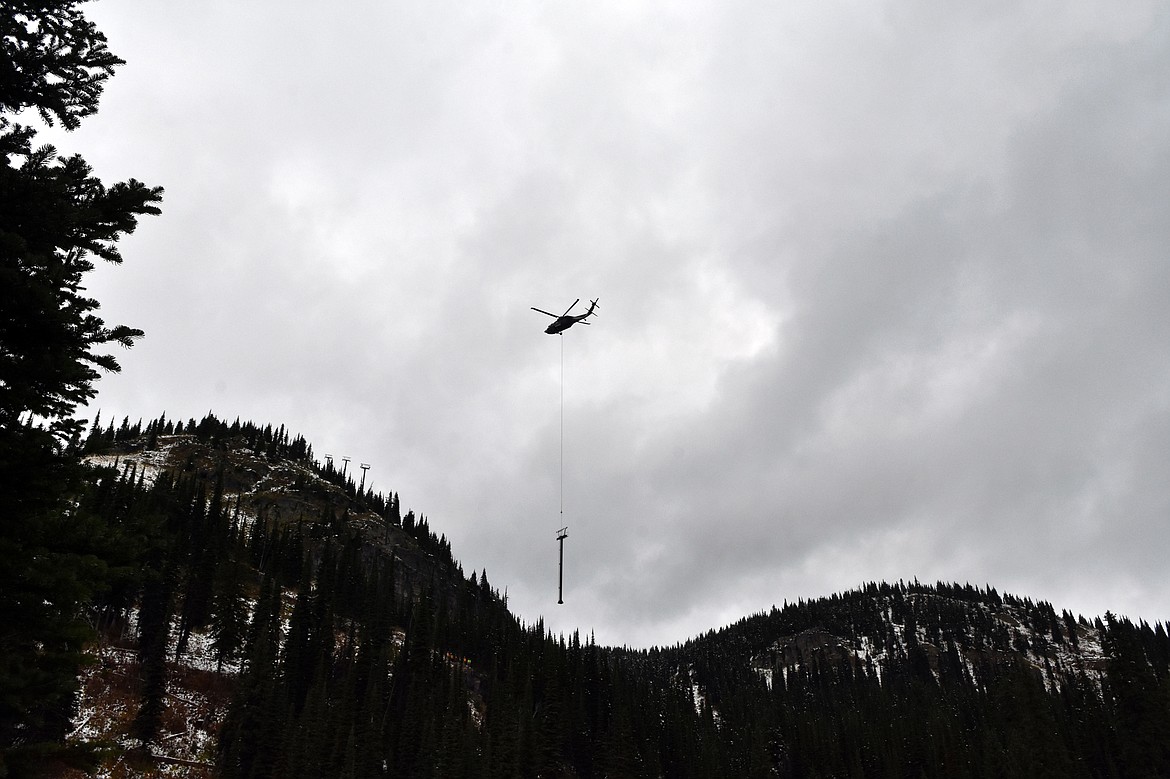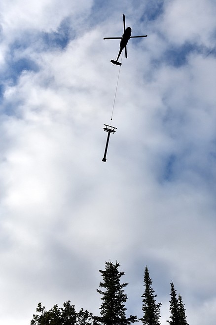 For about three hours a helicopter flew the 13 ski towers, crossarms and sheave wheels from the staging area up to the East Rim, where the towers were lowered and then secured by a ground crew. The relocation of Chair 5, which was announced by the resort in January, is a $1.2 million project aimed at improving access for advanced and intermediate terrain.