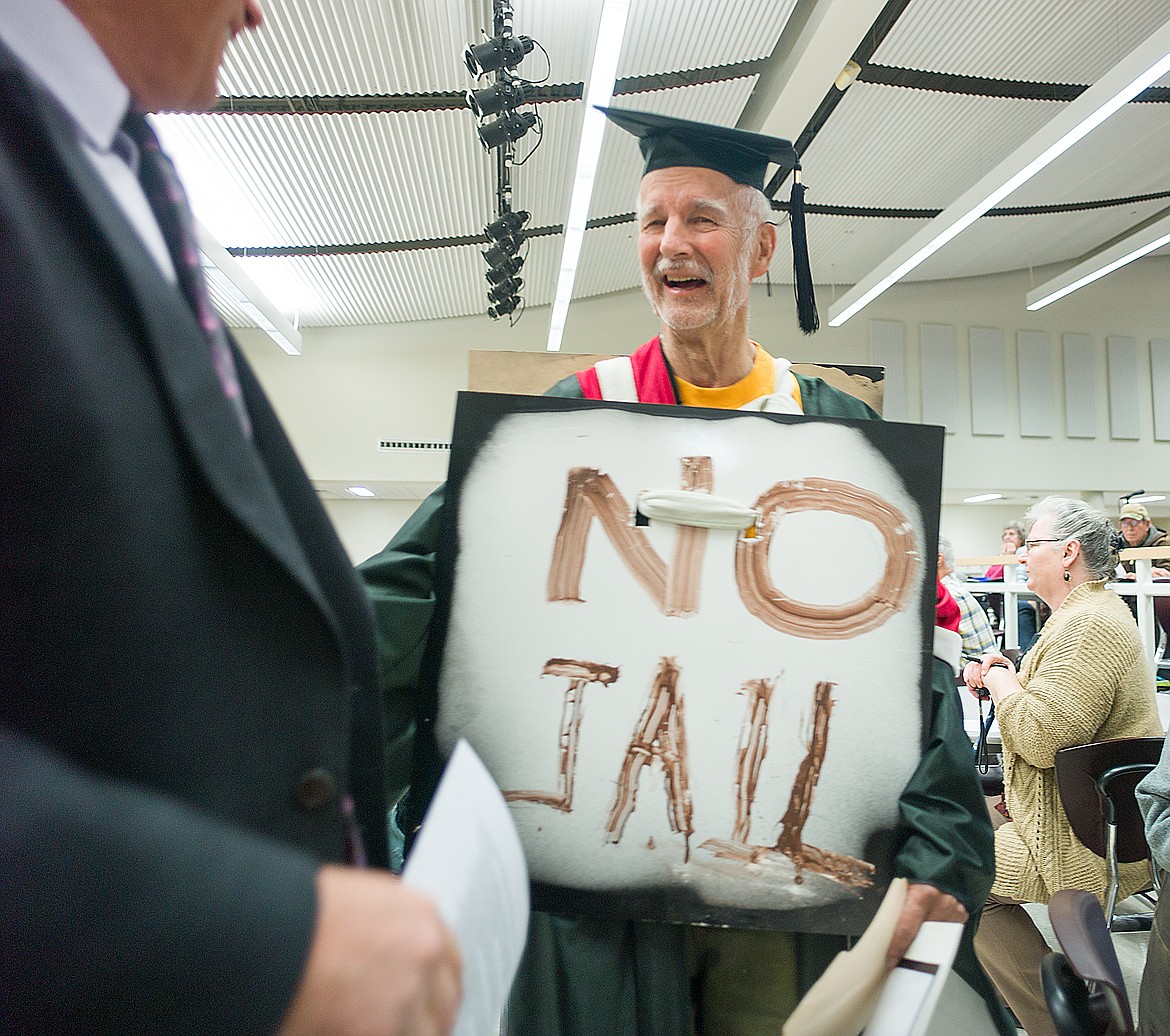 About 100 people showed up for the hearing, nearly all voicing opposition. Resident Tom Sluiter even wore a billboard that said, “No Jail.”