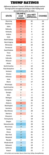 In fact, comparing how he did in the election last November with an approval ratings poll done by Gallup and SurveyMonkey last week, Trump has lost ground in all 50 states.