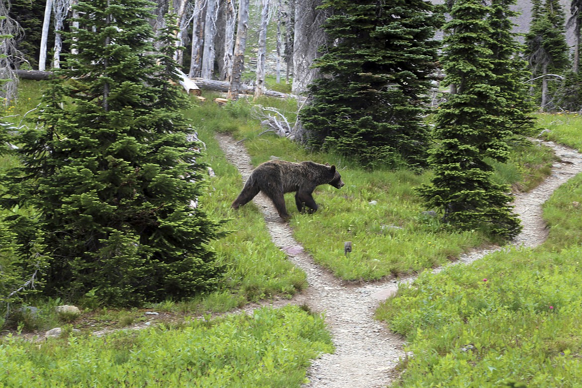 A grizzly bear pauses while feeding below Triple Divide Pass. (Chris Peterson/Hungry Horse News)