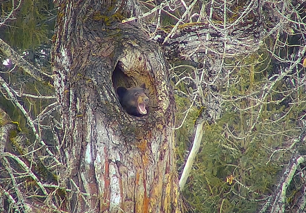 This week the park focused a webcam on a hollow cottonwood tree that’s home to a black bear. The bear has been lounging in the hole, basking in the sunshine about 100 feet in the air. Bears typically hang around their dens when they first awake from their winter slumber.