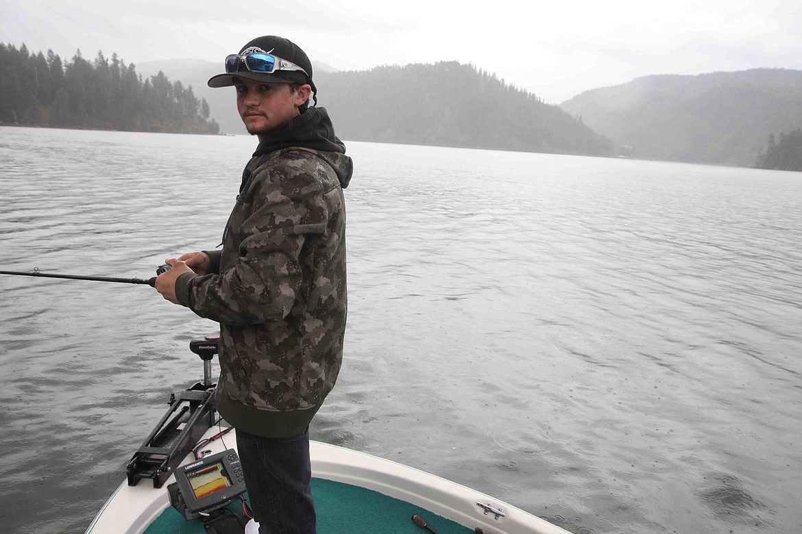 Dressed in a camo coat and a ballcap that advertises something outdoorsy, something to do with fishing, Mello watches the fish finder between his tennis-shoe clad feet as he casts toward shore across a drizzly Lake Coeur d’Alene.