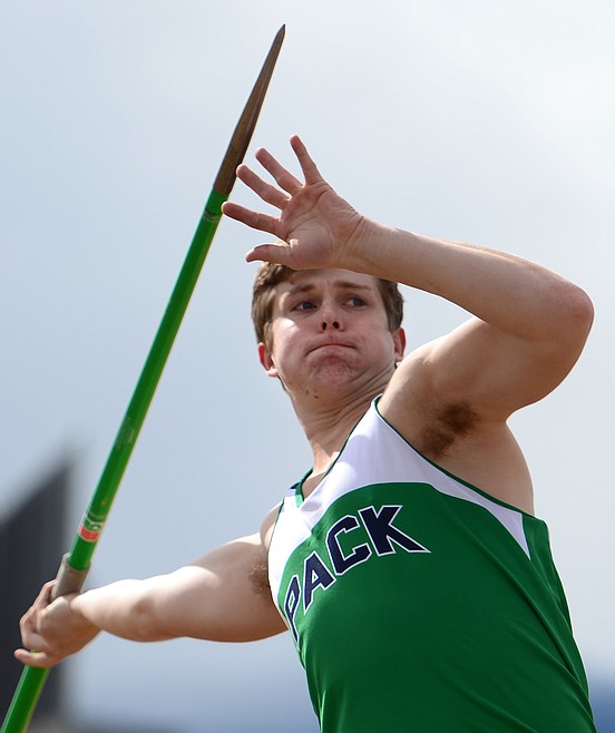 Glacier High School’s Bennett McChesney competes in the javelin during a meet with Flathead High School at Glacier High School on Tuesday. McChesney’s throw measured 163.4. (Casey Kreider/Daily Inter Lake)