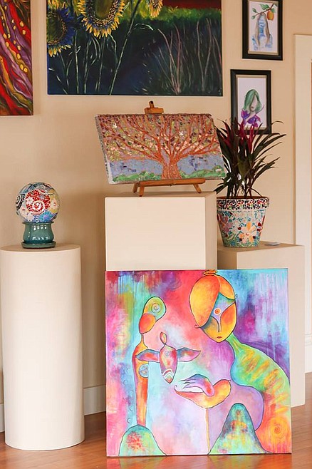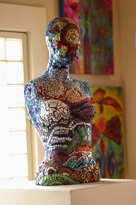 The bust of a mannequin sits in the window of the Post Falls Jacklin Arts and Culture Center. But, on further inspection, this is not an average mannequin. Its silhouette has been decorated with small pieces of tile and glass to create a mosaic depicting the journey of a woman finding a home, becoming a mother, and finding herself as an artist.