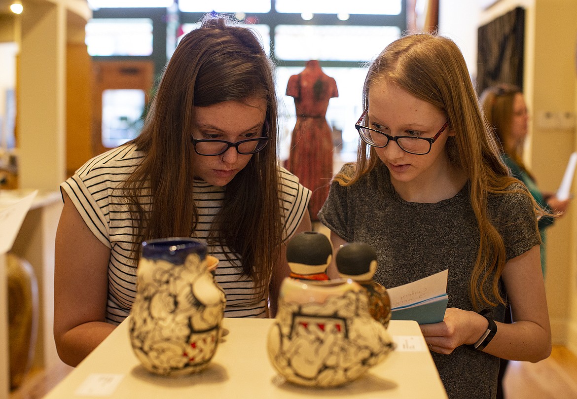 Clues such as "These badgers can dance all night" and "Businessmen may enjoy their coffee in these cups" led the students to discover the different themes, colors, textures and styles of the many pieces on display.