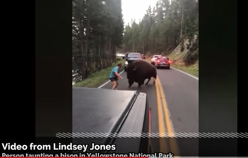 In a video that has circulated widely on Facebook, Reinke can be seen following the bison as it crosses the road, getting its attention and taking a menacing stance resembling that of a bullfighter. The bison charges him a couple times before the video ends.