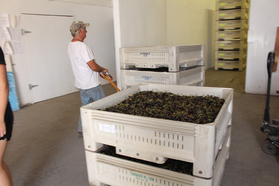 Size matters in cherries, with bigger cherries bringing more money; traditionally, cherries are measured by the numbers it takes to fill a row in an old-time cherry box. (The measurement system has since been codified, but it’s still called by the old name.) Nine-row red cherries were bringing $34 to $40 per box, while 9.5-row cherries were being sold for $30 to $35 per box. Ten-row cherries were being sold for $26 to $32.90 per box, and 10.5 row cherries were bringing $26 to $30.90 per box.
