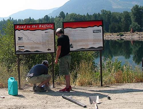 New Road to the Buffalo signs are fabricated and installed by Casey Steinke, left, owner of Top Sign & Graphics of Helena. Steinke was helped by his brother. Each sign panel tells a different part of the early history of Sanders County, starting with David Thompson and the fur trade in 1809, and ending with the arrival of the Northern Pacific Railroad in the early 1880s.