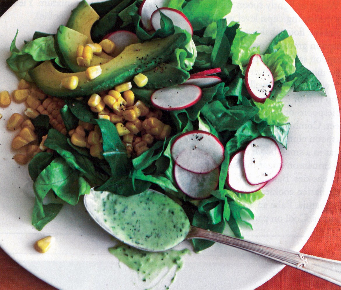 Reserve 4 whole lettuce leaves in shallow salad bowls. Chop remaining lettuce to measure 4 cups. Combine with avocado mixture, corn and radishes Spoon lettuce mixture into leaves, top each with 2 tablespoons of dressing. Serve.