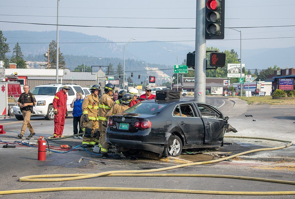 Libby volunteer firefighters doused the car with water, then Libby Volunteer Ambulance members moved in with spreaders, electric saws and other equipment and began extrication with the firefighters’ help.