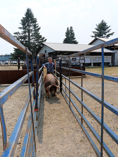 A young 4-Her guides his swine into the indoor arena at the Bonner County Fairgrounds during the annual Market Animal Sale. Dozens of steer, sheep, goats and swine were auctioned off during the event to local businesses and individuals.